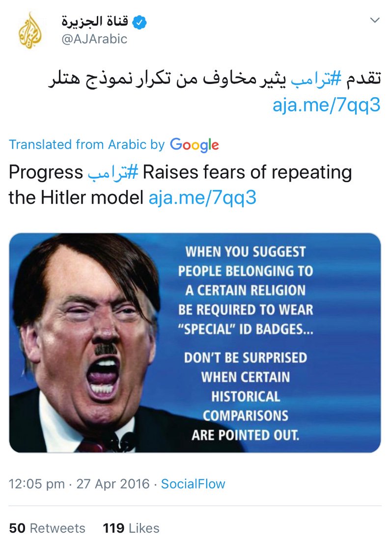 Another tweet from Qatar’s channel Al-Jazeera about President Trump https://twitter.com/AJArabic/status/725355094519255040?s=20 …pic.twitter.com/tWoAlquiZN