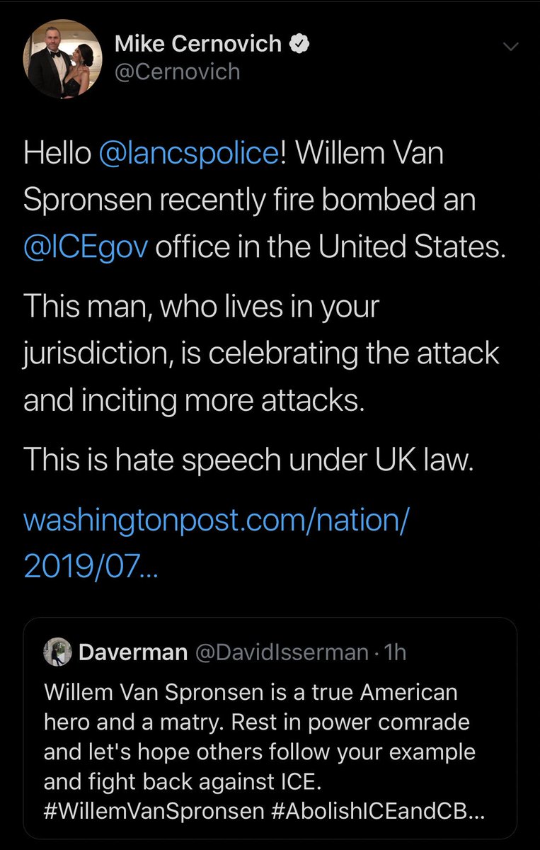 Hello @lancspolice! Willem Van Spronsen recently fire bombed an @ICEgov office in the United States.