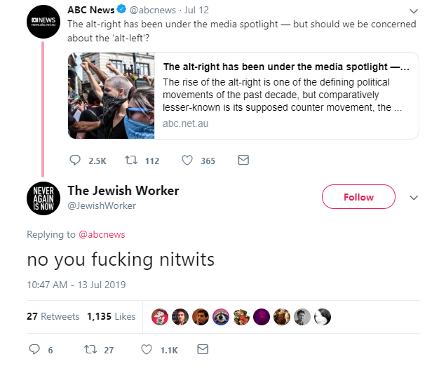 He's mad about ABC asking the right question...."The alt-right has been under the media spotlight — but should we be concerned about the 'alt-left'?"pic.twitter.com/28PfN1YZcy