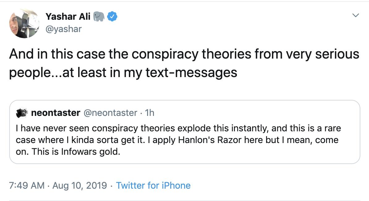 How can you even call in a “conspiracy theory?” LOL. Many people predicted this would happen as soon as he was arrested.