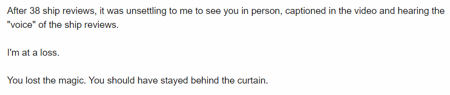 Ugh, I’m sorry. Just ignore the haters. I love what you do and keep finding myself going back to your Elite Dangerous ship reviews as I look to expand my fleet. You are beautiful.