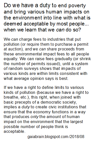 Related to our shared right to decide limits to humans' impacts on the env't is a shared responsibility to create systems of governance that function so as to bring impacts of various kinds into line w/ what most people think is acceptable. A shared duty? http://gaiabrain.blogspot.com/2018/08/do-we-have-moral-duty.html …pic.twitter.com/HAW9qZ13IK