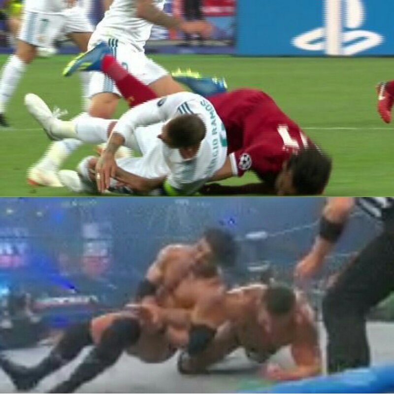 @SergioRamos did not get a red card after doing a WWE stunt on Mo Salah? Lots of wickedness in this planet#UCLfinalpic.twitter.com/WnAXBC5YGO