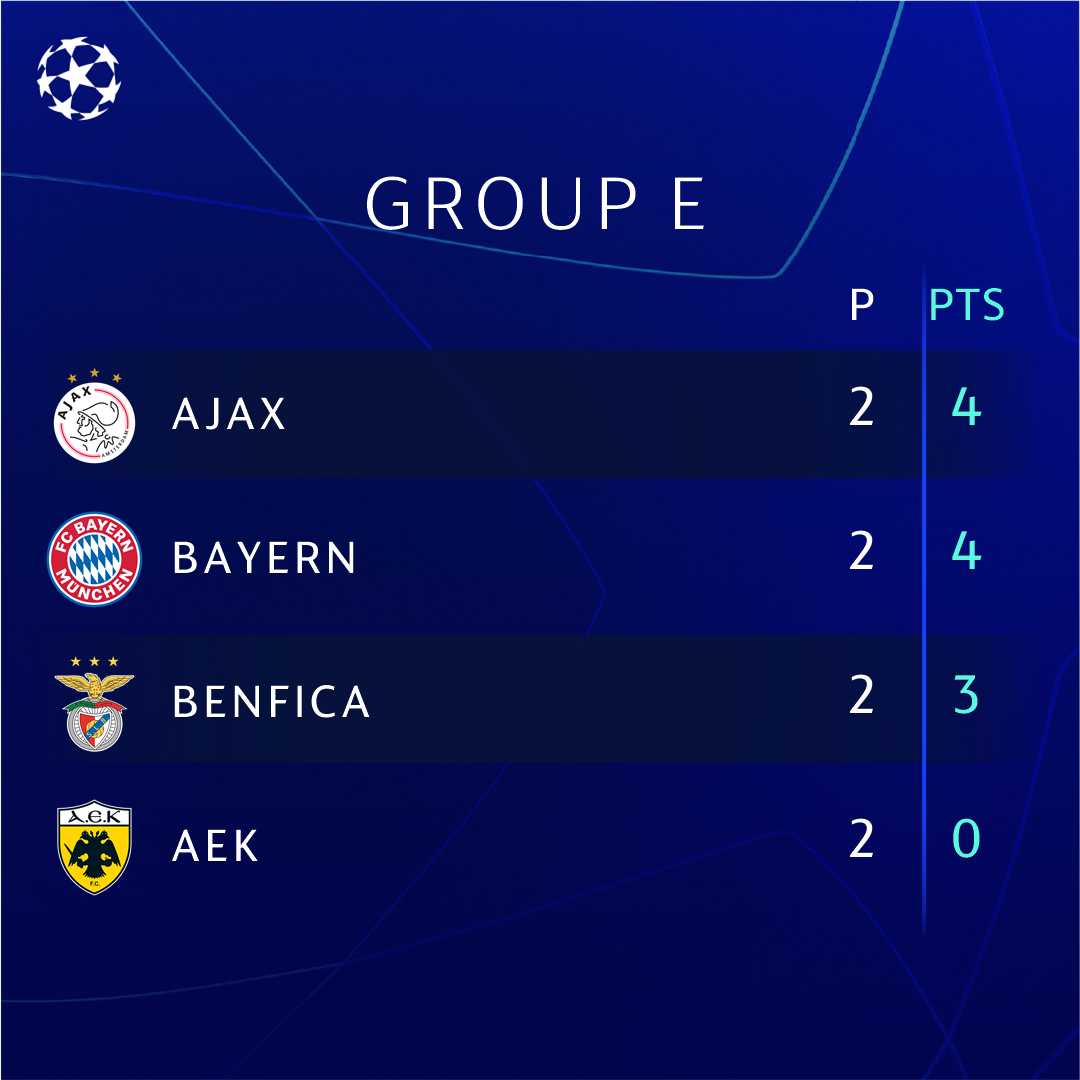 E: Bayern, Ajax F: Lyon, Hoffenheim G: Madrid, Roma H: Juventus, United