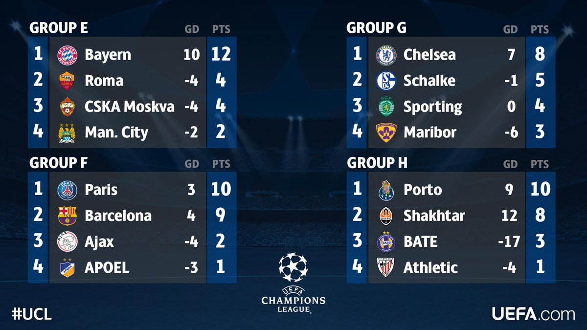 @ChampionsLeague: This is how#UCL Groups E-H are shaping up... who will advanceBayern. Barcelona, Porto and Paris? pic.twitter.com/FPaBiDavY0”
