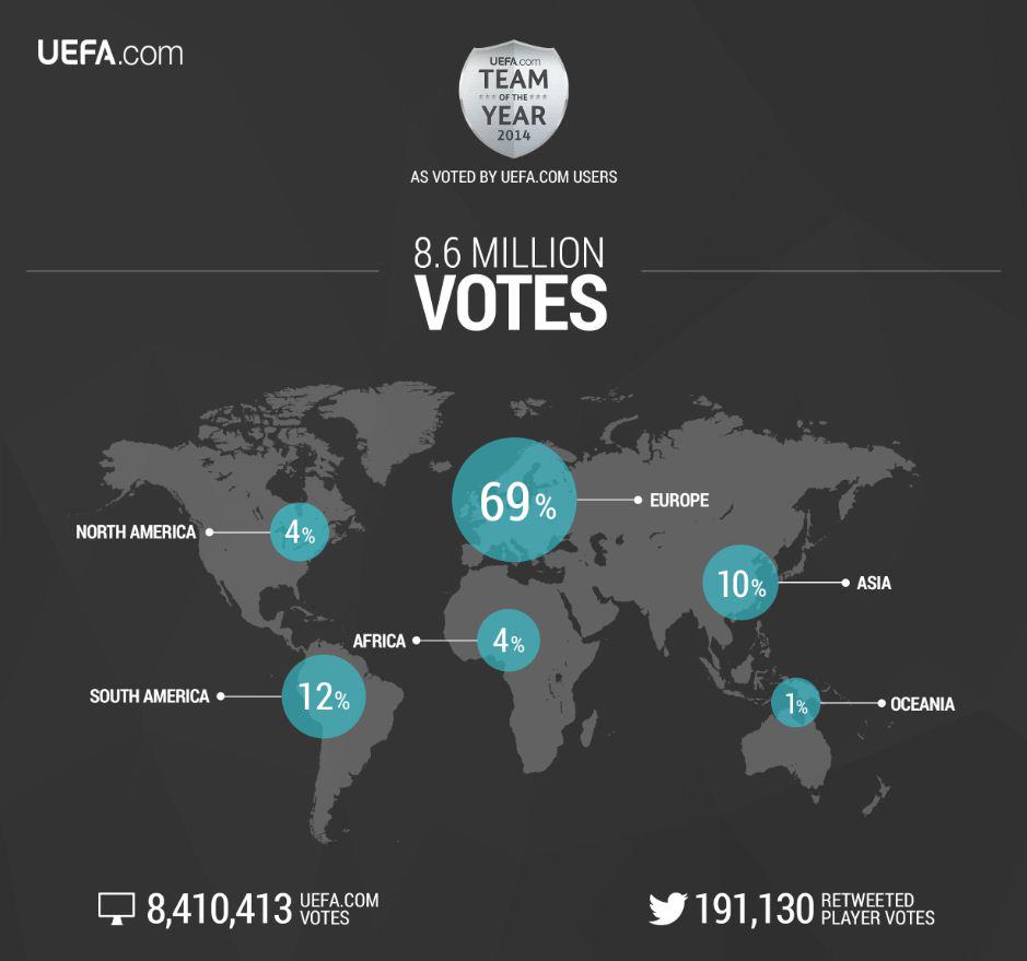 @ChampionsLeague: Over 8.6m#TeamOfTheYear votes were cast, but where did they come from? http://uefa.to/1eP2Ttu pic.twitter.com/RbPaX5K0nr”