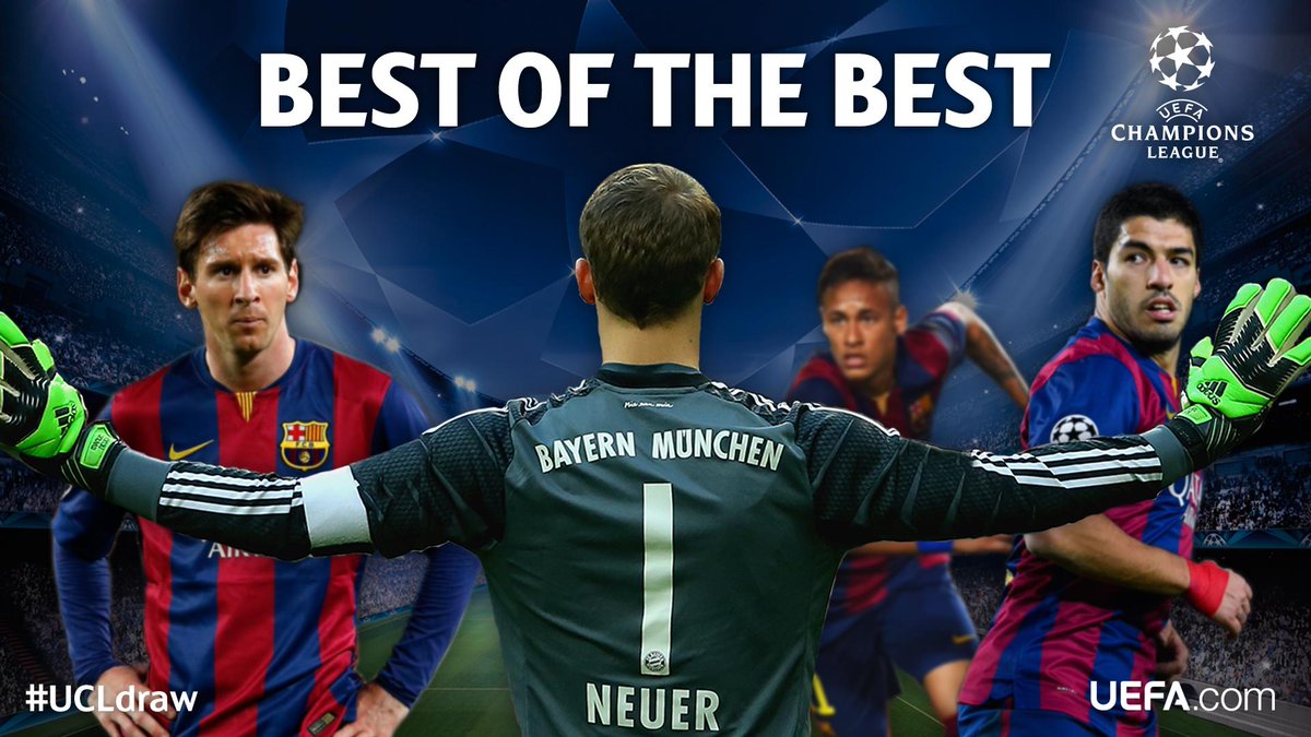 @ChampionsLeague: Messi,@neymarjr and@LuisSuarez9 take on@Manuel_Neuer. Best attack v best keeper?#UCLdraw pic.twitter.com/P3Es5UxRx1”