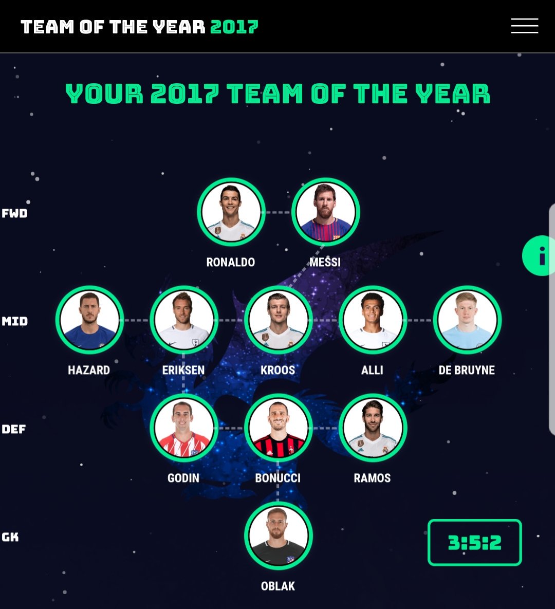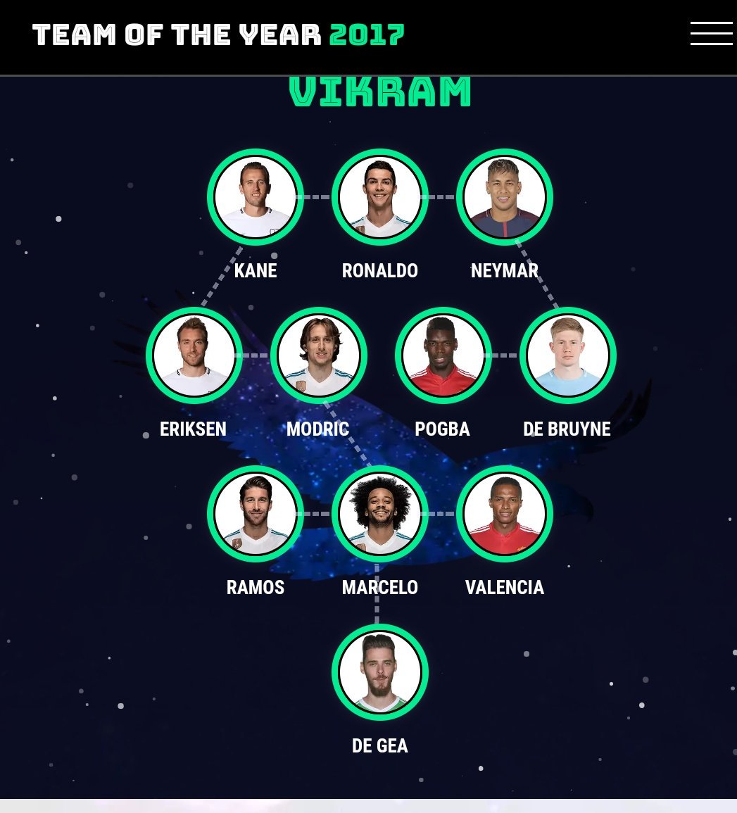 1. Ronaldo. 2. Messi. 3. Neymar 4. De Gea. 5. Marcelo. 6. Ramos. 7. Eriksen. 8. Hazard. 9. Carvajal. 10. Kroos. 11. Isco.