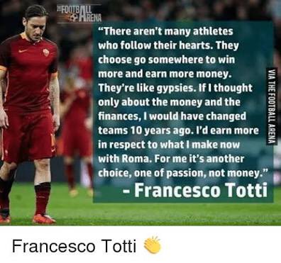 Totti proved us that high salaries from other clubs can't convince one to leave their club. This guy is the most loyal player I've ever seen this decade.