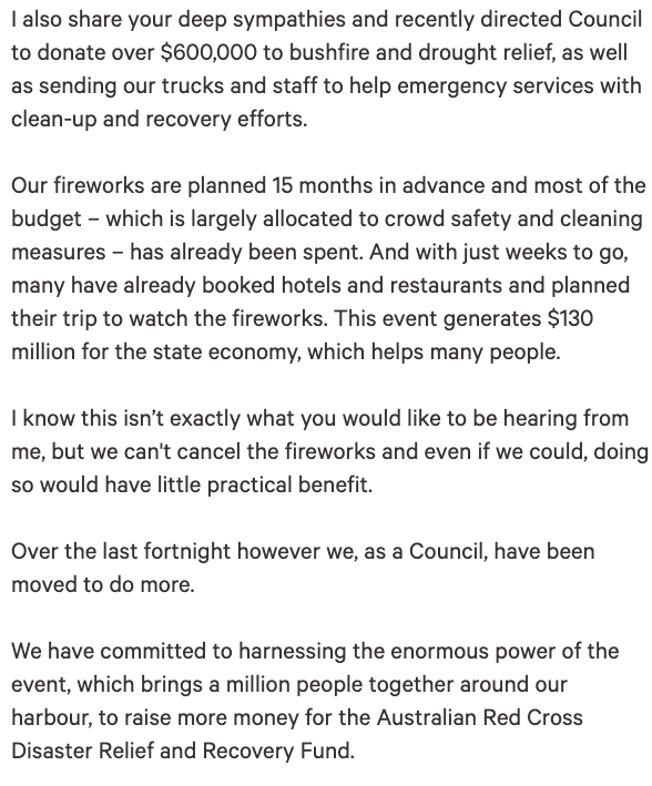 @CloverMoore has responded to 147,000@ChangeAus signers calling for the Sydney NYE fireworks to cancelled. Response: https://www.change.org/p/scott-morrison-reallocate-the-firework-budget-your-house-is-already-on-fire/responses/42603 …#bushfiresNSW#bushfirespic.twitter.com/9WyDT60Swm