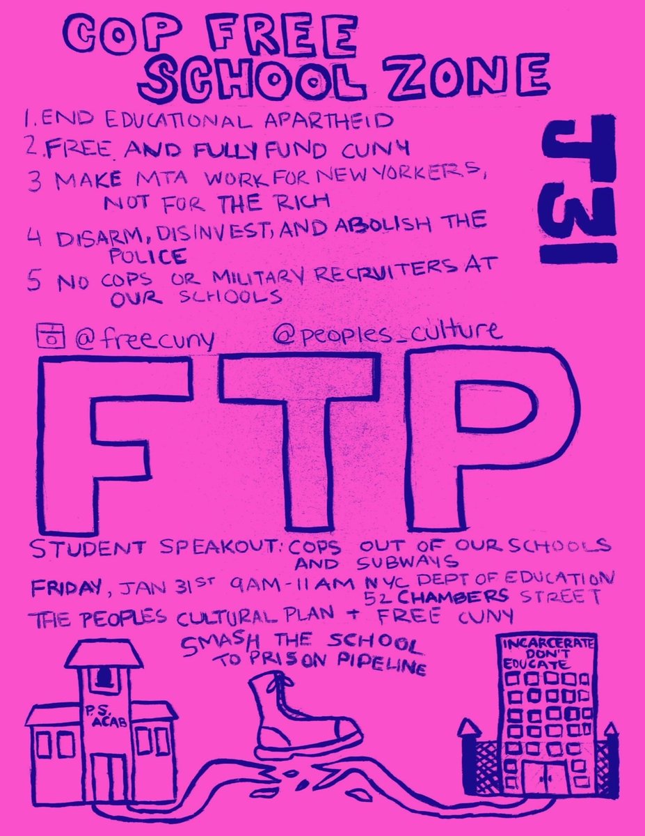 #FTP3 solidarity action on#J31 demanding COP FREE SCHOOL ZONES 9am-11am at the Department of Education (52 Chambers St. New York, NY 10007). Come thru!@cuny_free@Cultural_Plan#decolonizethisplacepic.twitter.com/Y9maBykg4k