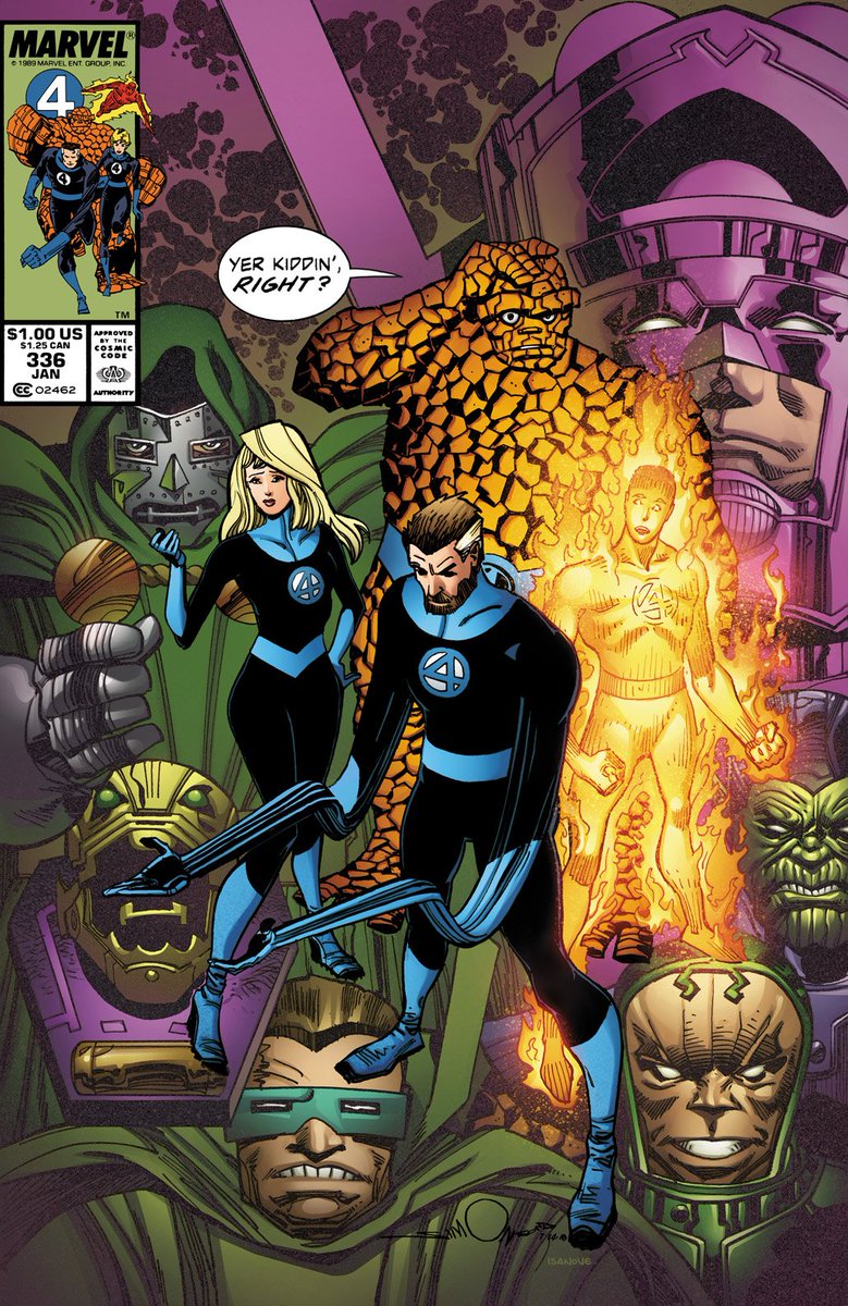 Fantastic Four 1 variant cover. Color by Richard Isanove. This is the scan for a final color approval. The drawing is actually a variant variation of my own cover for FF 334 from a million years ago. Consequently, the corner box, scanned from my art, was updated in the final.pic.twitter.com/0Kkt75HP5m