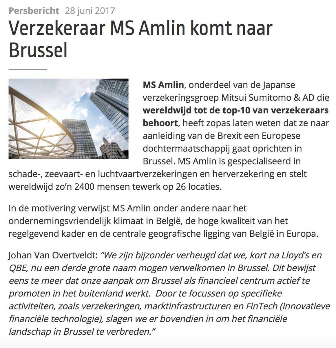 Opnieuw een grote verzekeraar die voor Brussel kiest. Aanpak om Brussel als financieel centrum te promoten, werkt! http://bit.ly/2uhDxlD pic.twitter.com/MqwBdKYHQ1