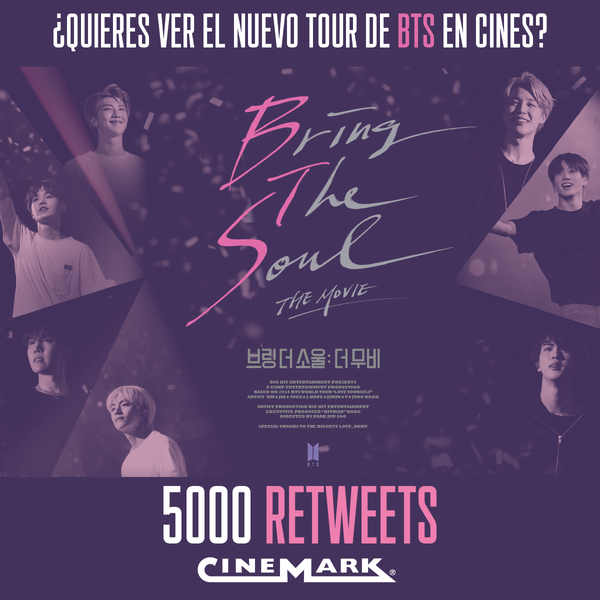 #BTS se esfumó o tenemos ARMYS leales y comprometidas que quieren ver a sus bias en la gran pantalla? Haz retweet a este post con el hashtag#BTSEnCinemark Si logra los 5000 retweets lo proyectaremos en nuestras salas. ¡Es hora de demostrar tu amor sincero por BTS!pic.twitter.com/EW6GCDdGC3