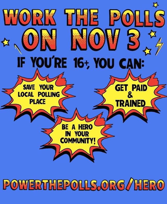 Don’t let your local polling place close! If you’re over 16, sign up TODAY to be a poll worker at http://powerthepolls.org/hero  & share! You not only get paid for your heroic work, but you’ll help end the national poll worker shortage we’re facing in 2020. Everyone gets free PPE too.pic.twitter.com/ZZPnCuwCE8