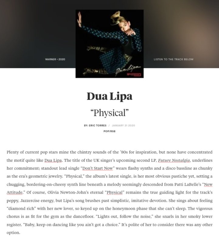 “Plenty of current pop stars mine the chintzy sounds of the ’80s for inspiration, but none have concentrated the motif quite like Dua Lipa.” — Pitchforkpic.twitter.com/MPlHf70PgF