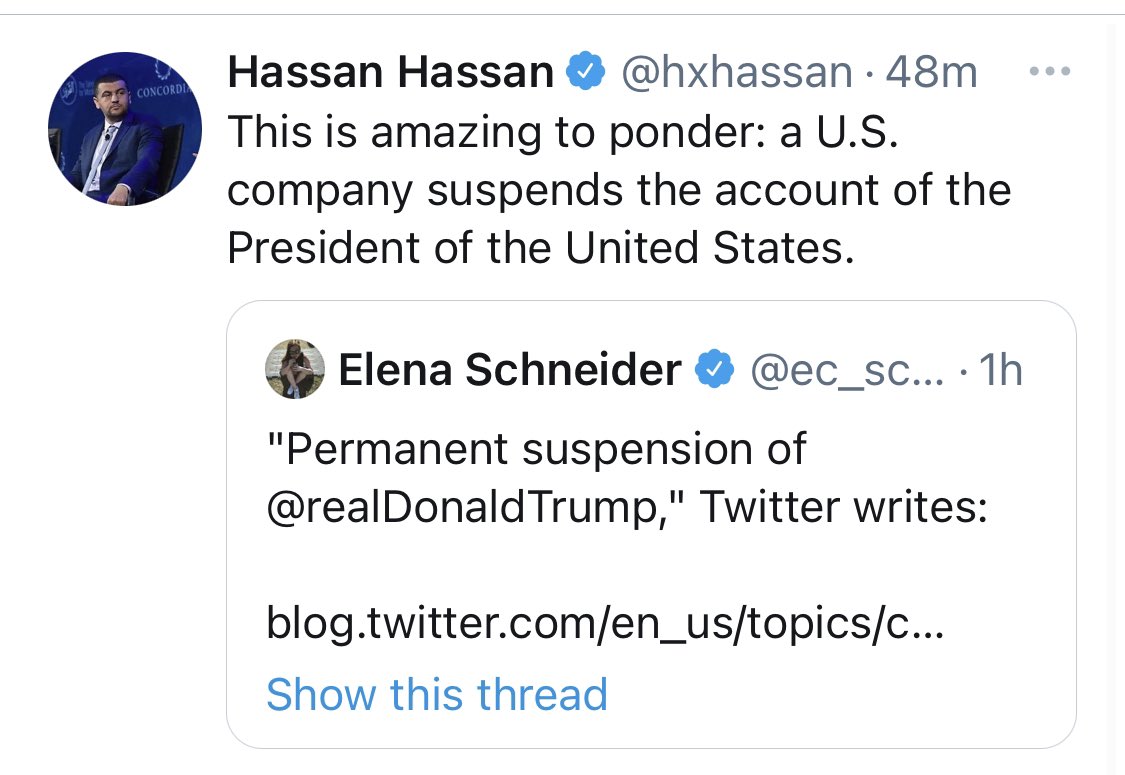This is amazing to ponder: a U.S. company suspends the account of the President of the United States.https://twitter.com/ec_schneider/status/1347685369597349891 …