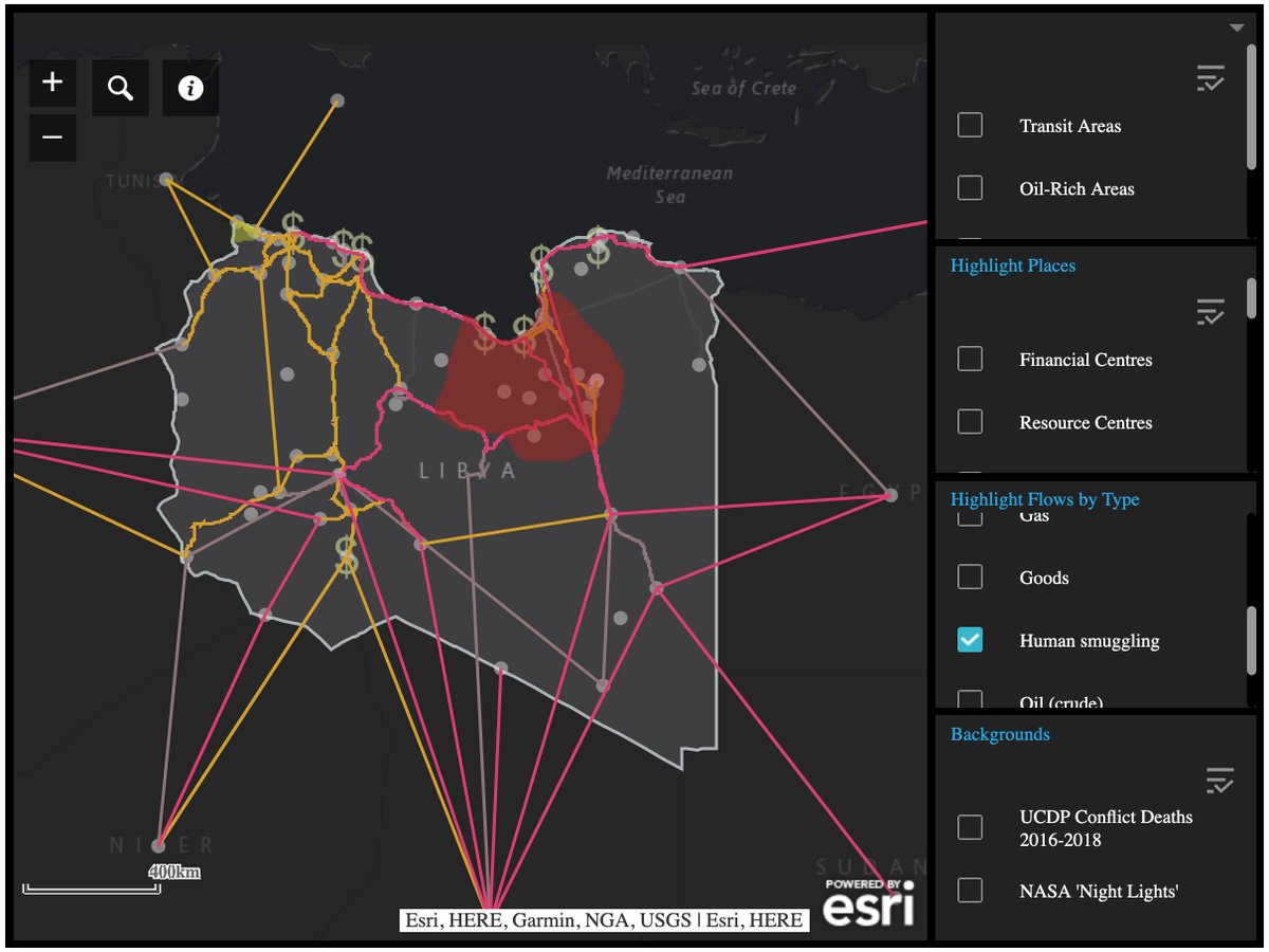 The recent Chatham House Conflict Economies report hosts interactive visualizations mapping economic activity outside of state control in Iraq, Libya, Syria and Yemen. MAP: Flows of drugs, fuel and and human smuggling In Libyapic.twitter.com/XsxeUpFxxv