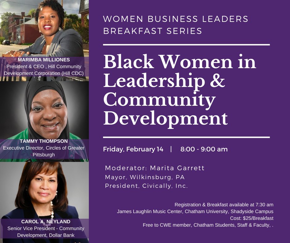 #BlackHistoryMonth2020,@CWEChatham and@WomensInst at@ChathamU will host a panel of speakers representing “Black Women in Leadership & Community Development" for our#breakfastseriescwe on Feb 14. Visit the link to meet our speakers: https://bit.ly/2TSOVEu pic.twitter.com/ItZ0SLPqPl