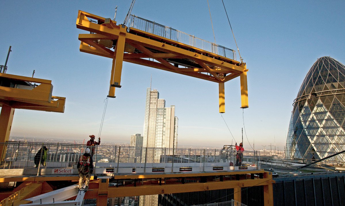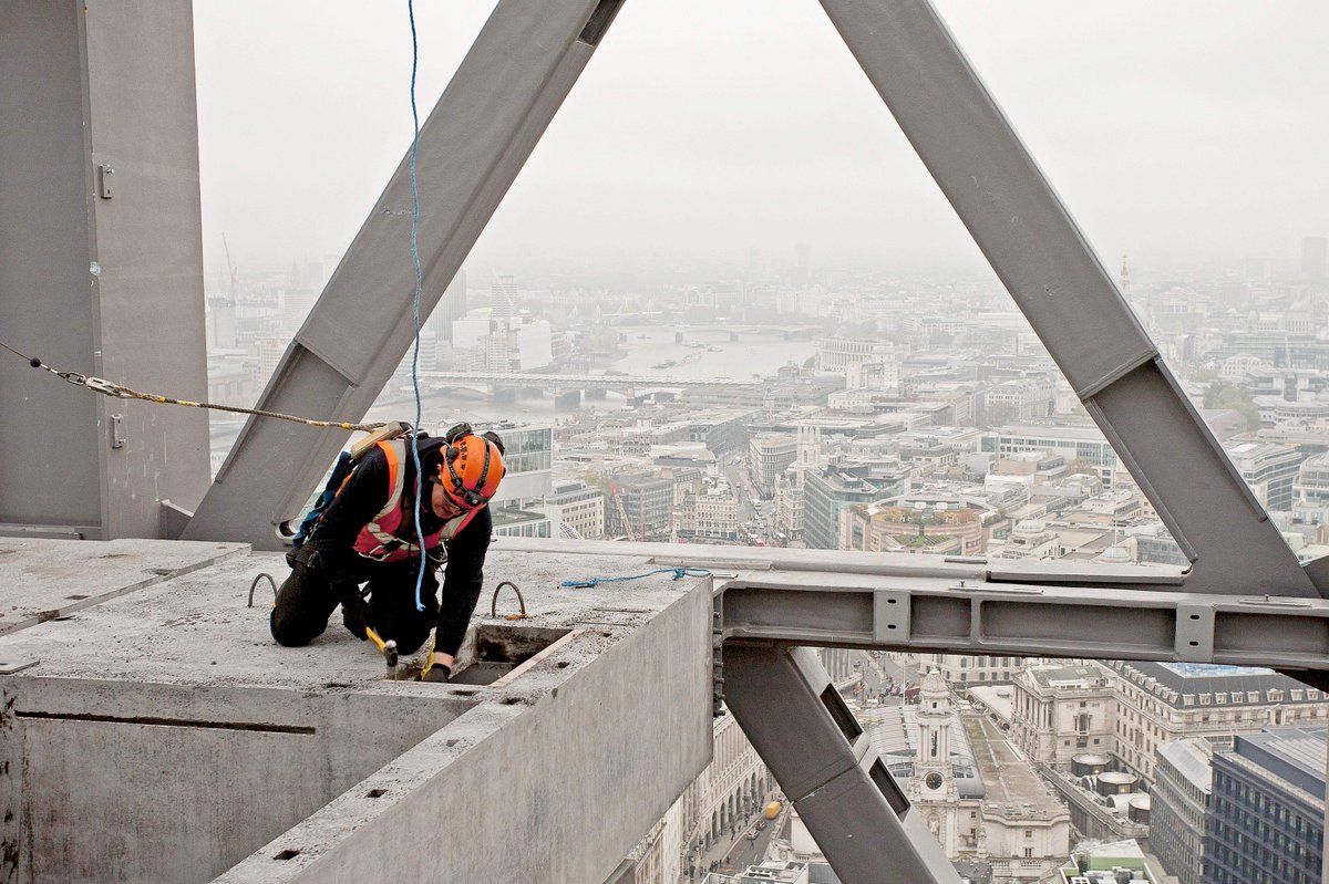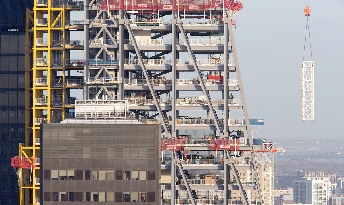 Soaring into the sky, this shot captures the building's signature electric mustard steelwork being covered in a glass façade