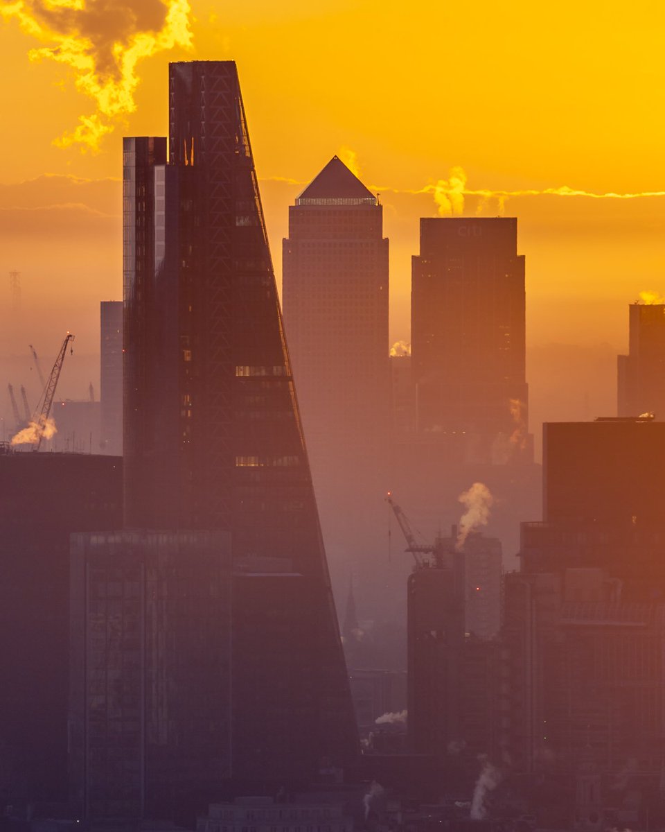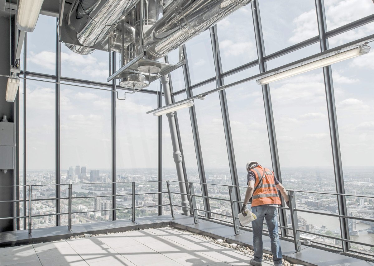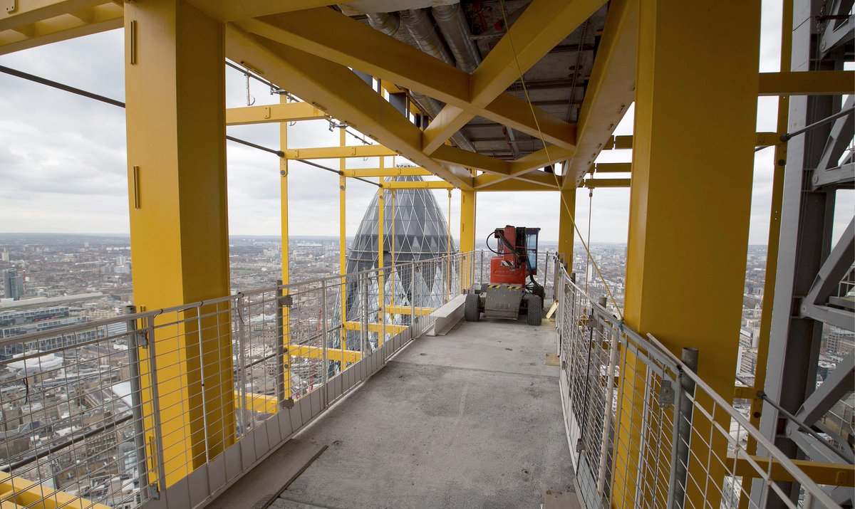 Looking out to Canary Wharf, this shot shows The Cheesegrater's plant room in its final form