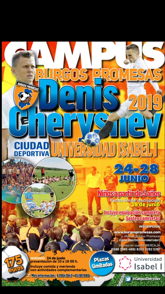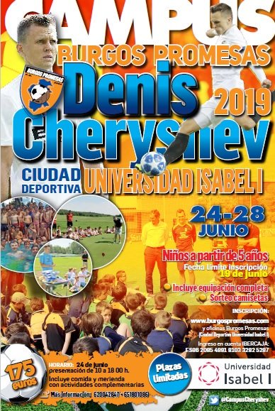 @CampusCheryshev echa a rodar del 24 al 28 de Junio en la Ciudad Deportiva Universidad Isabel I@ui1Universidad. Una vez más el Campus será apadrinado por nuestro querido@Cheryshev. INSCRIBTE YA!! Más información en la web http://www.burgospromesas.com pic.twitter.com/iCeTSphfqZ