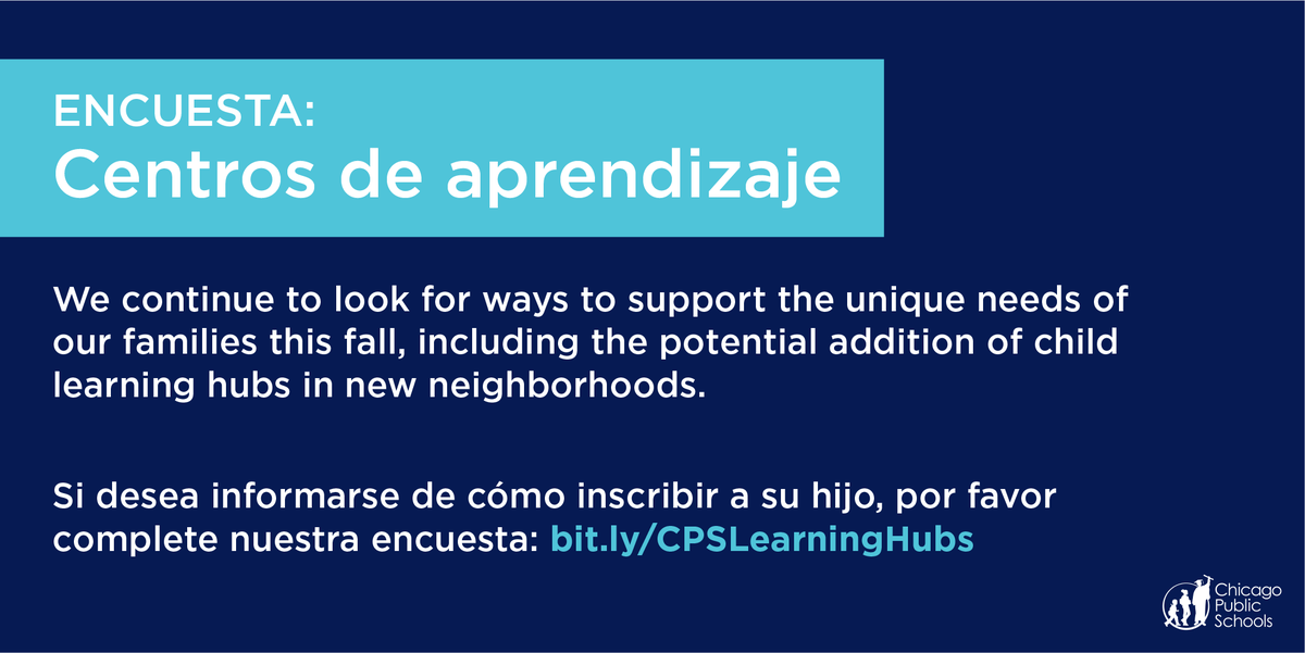 Este otoño, seguimos buscando maneras para atender las necesidades únicas de las familias, que podrían incluir la creación de centros de aprendizaje en nuevas vecindades. Si desea informarse de cómo inscribir a su hijo, por favor complete nuestra encuesta: http://bit.ly/CPSLearningHubs pic.twitter.com/ptRvrA2rUv