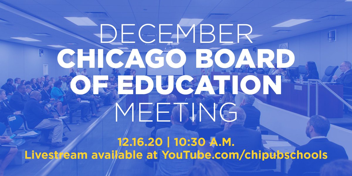 The Chicago Board of Education's Dec 2020 Board meeting will proceed remotely today, Wed 12/16 at 10:30 am. Watch the livestream at http://YouTube.com/chipubschools pic.twitter.com/xeowvh4g9U