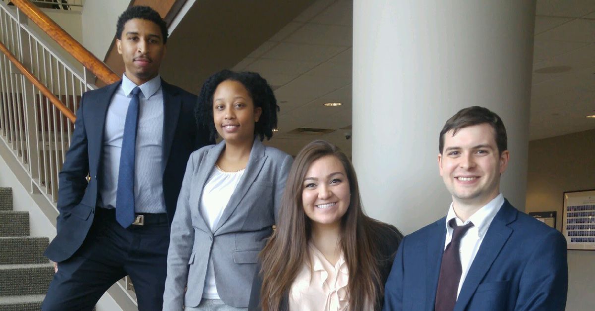 Congrats to Presley Valenzuela (2nd from right) & Michael Brew (right), who won the ABA Negotiation Competition's Region 7 championship, and to Justin Taylor (left) & Imani-Ari Asanté, who placed third! Read more: http://bit.ly/2yxtuLJ pic.twitter.com/fShmU2qSqK
