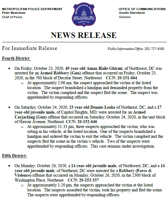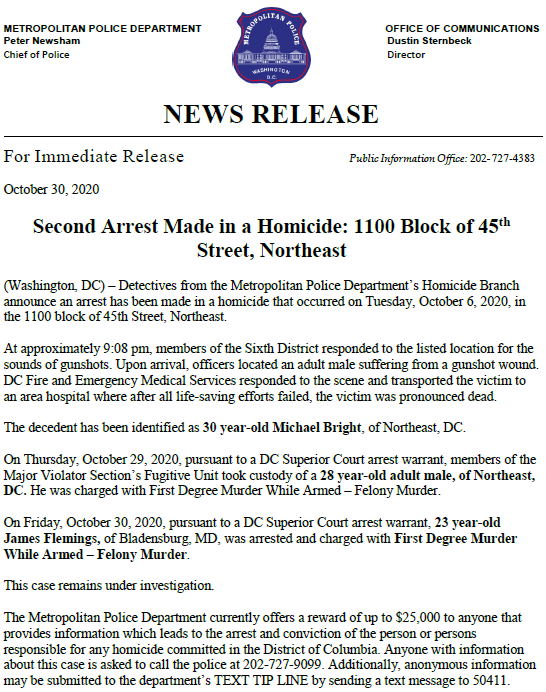 MPD announces an arrest has been made in a Homicide that occurred on 10/6/20 in the 1100 blk of 45th Street, NE. Thank you to all who assisted in making DC safer with this arrest! Release: https://bit.ly/2HK3k24 pic.twitter.com/YmIXrOGlEW