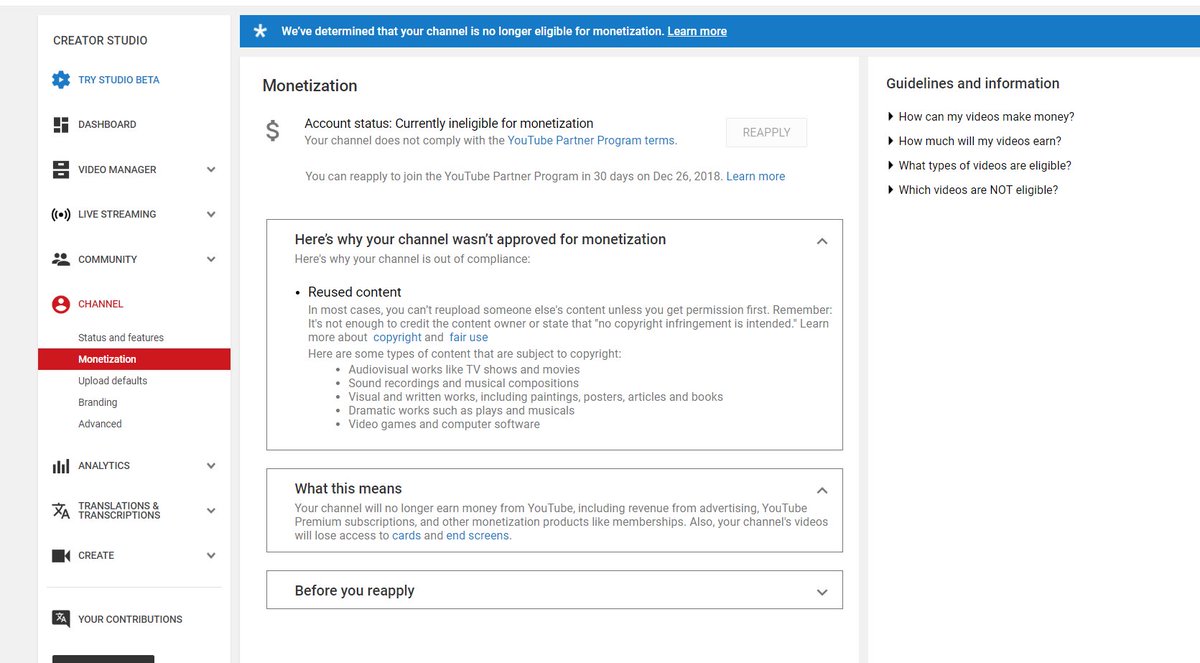 @YouTube@YouTubeSpaceLA@YTCreators@TeamYouTube Please look into this issue! I got wrongfully demonetized as have many others! I have even been worked with 2 seperate Youtube Patner Managers in the past.pic.twitter.com/hlfd3ALrof