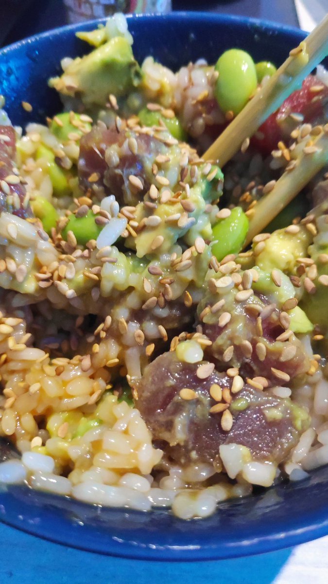 Pues quedó rico!! Arroz, aguacate, atún, edaname, semillas de sésamo y salsa de soja y sweet chilli.pic.twitter.com/OlWQJFlNup