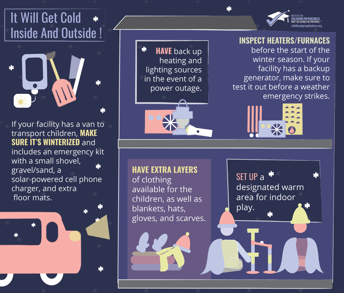 #Tips for#Childcare#Providers: Have back up heating & lighting in the event of a power outage. Have extra layers of clothes, blankets, hats, gloves, & scarves.#childcare#safety#daycare#preschool#emergency#preparedness#emergencypreparedness#shelterinplace#cold#heatpic.twitter.com/JuLESWNcip