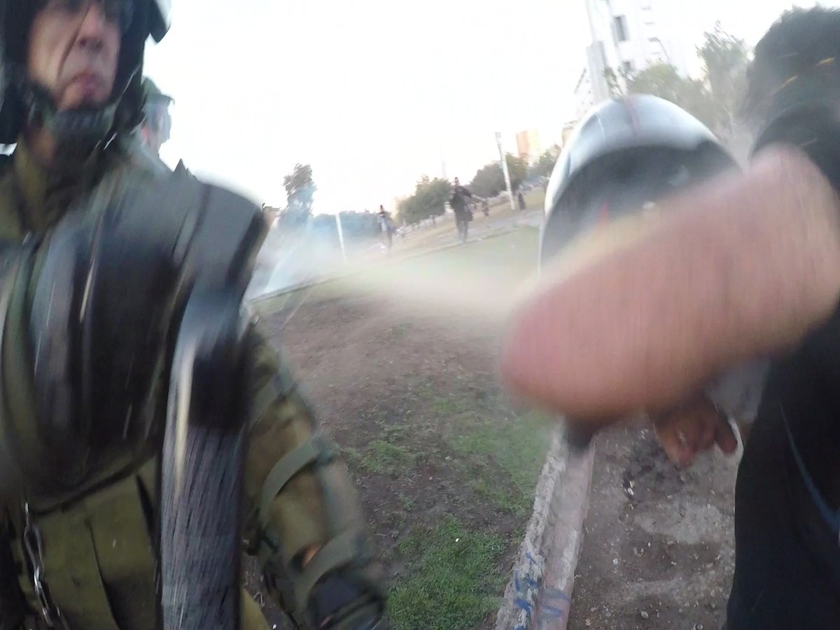 Transmitíamos "copamiento" anunciado por Intendencia. Si estrategia falló, entendemos que estén frustrados @carabdechile, pero no es culpa de prensa. Queremos saber qué parte del protocolo indica "sacar lentes a camarógrafos y arrojar gas pimienta en los ojos". Mayor J. Muñoz.Gpic.twitter.com/NU2Oo1i8Kg