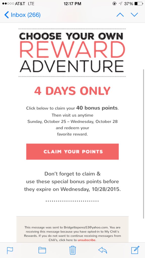 Hi, welcome to Chili's. // Guest Service: @ChilisSupport