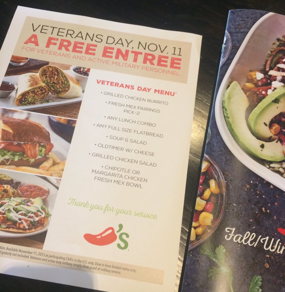 Excellent work @Chilis you came through again this #VeteransDay #lisaeatsfree and she's loving it!pic.twitter.com/V4SzyJLgDq