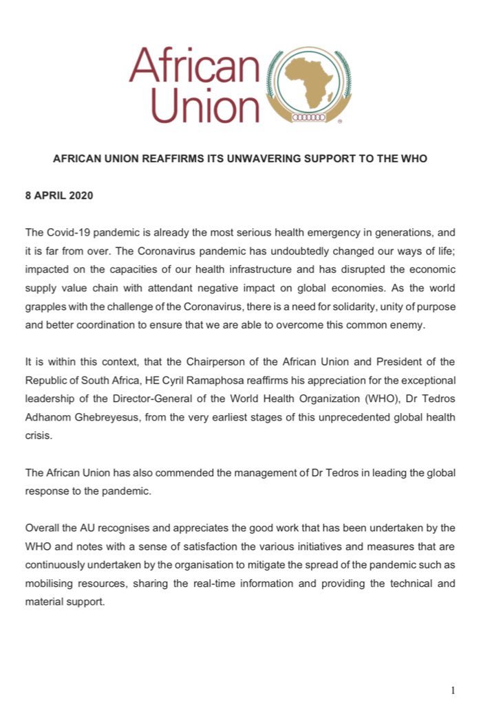 The message is clear. We fully share your points, your Excellency. The most important thing at this moment is to save lives. WHO'S leading role is irreplaceable.https://twitter.com/CyrilRamaphosa/status/1247991758627188736 …