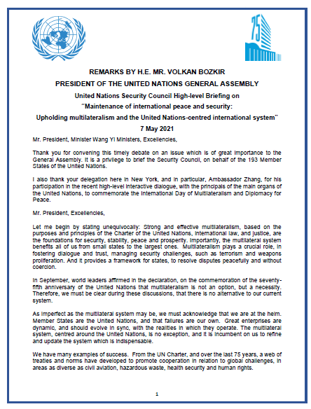 Thank you @UN_PGA @volkan_bozkir for briefing the high-level meeting chaired by H.E. Wang Yi. It's crucial for the Security Council and the General Assembly, as main UN organs, to honor their respective duties and form synergy in maintaining international peace and security.https://twitter.com/UN_PGA/status/1390652693866160138 …