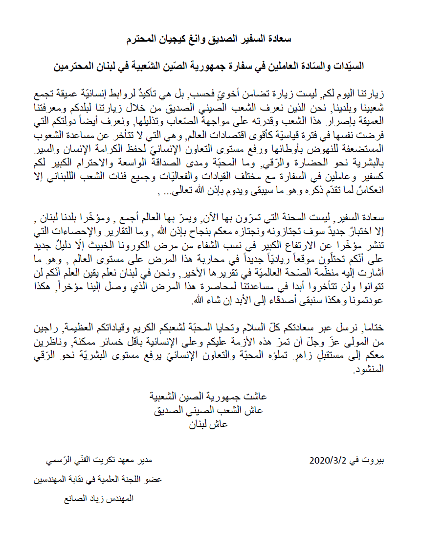 تلقيت رسالة تضامنية من مدير معهد تكريت الفني الرسمي المهندس زياد الصانع عبر فيها عن تضامنه مع الشعب الصيني في مكافحة فيروس كورونا ويؤكد ثقته بنجاح الصين ولبنان والعالم جميعا في اجتياز اختبار كورونا. كل الشكر والتقدير له وللأصدقاء اللبنانيين.pic.twitter.com/KjzhyHTV8G