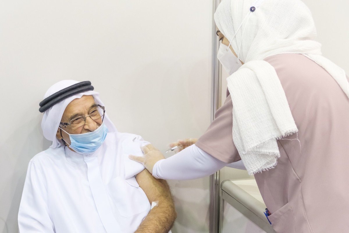 معالي الفريق طبيب الشيخ محمد بن عبدالله آل خليفة رئيس المجلس الأعلى للصحة رئيس الفريق الوطني الطبي للتصدي لفيروس كورونا (كوفيد-19) ، يتطوع في التجارب السريرية الثالثة للقاح كورونا (كوفيد-19)