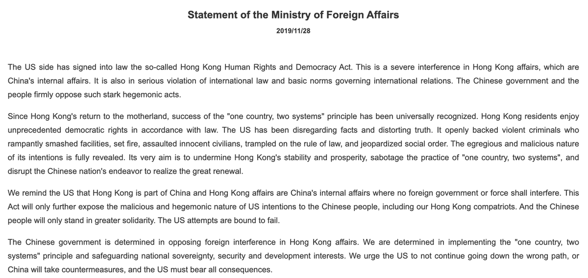 Statement of the Ministry of Foreign Affairs of the People's Republic of China The US side has signed into law the so-called Hong Kong Human Rights and Democracy Act. This is a severe interference in #HongKong affairs, which are #China’s internal affairs. 1/9pic.twitter.com/EEZVmU9TDP