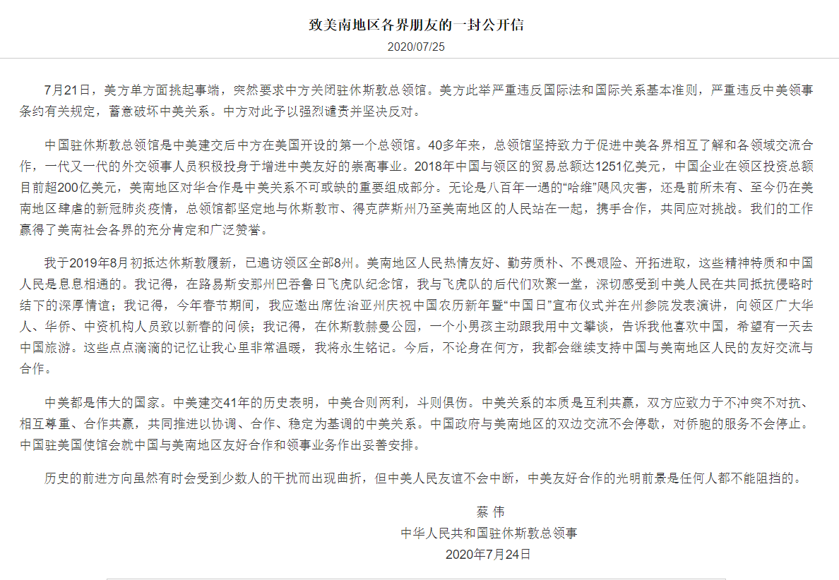 中国驻休斯敦总领事蔡伟致美南地区各界朋友的一封公开信:历史的前进方向虽然有时会受到少数人的干扰而出现曲折,但中美人民友谊不会中断,中美友好合作的光明前景是任何人都不能阻挡的。https://bit.ly/2WV3WX5 pic.twitter.com/gPbf2UIx4Q