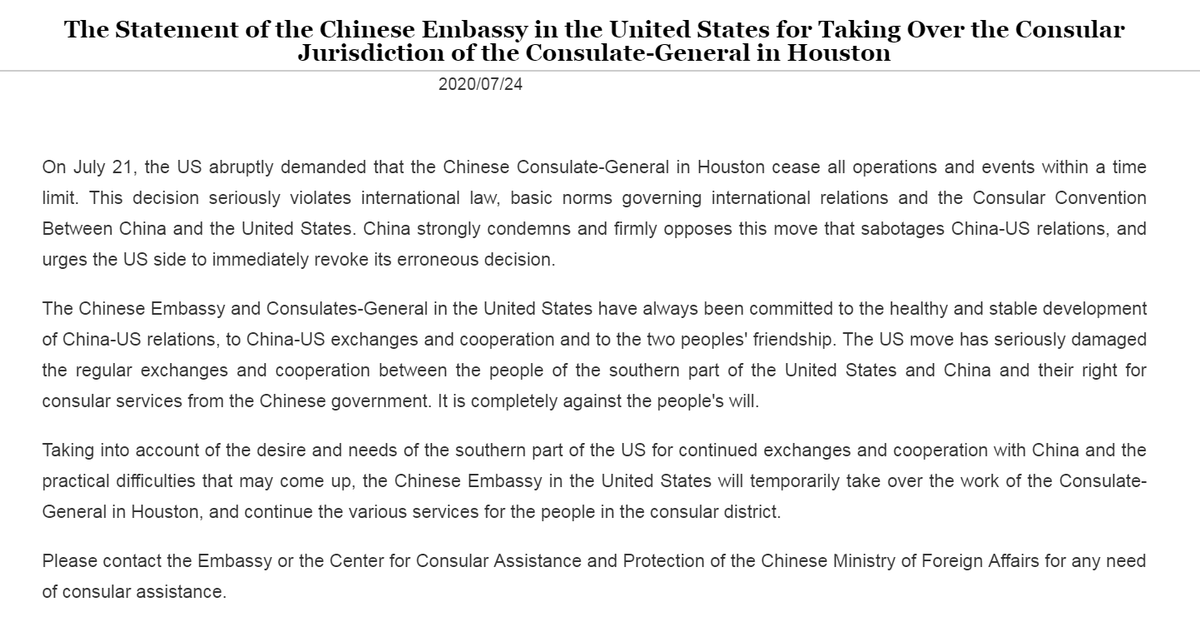 关于中国驻美国使馆代管驻休斯敦总领馆领区工作职责的声明 The Statement of the Chinese Embassy in the United States for Taking Over the Consular Jurisdiction of the Consulate-General in Houston https://bit.ly/2EkKsVx pic.twitter.com/Sx52LmdxgN