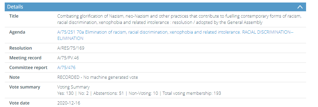 On Dec. 16, the #UN General Assembly adopted resolution “Combating glorification of Nazism, neo‑Nazism and other practices that contribute to fuelling contemporary forms of racism, racial discrimination, xenophobia and related intolerance”.pic.twitter.com/KEWDq5rhGW