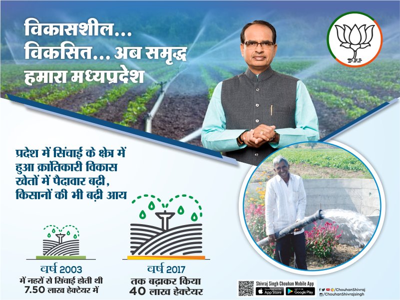 कांग्रेस के समय मध्यप्रदेश की सिंचाई क्षमता साढ़े सात लाख हेक्टेयरहुआ करती थी, यह अब बढ़कर चालीस लाख हेक्टेयर हो गई। मुख्यमंत्री @ChouhanShivraj की सरकार इसे अगले सालों में बढ़ाकर दोगुना करने के लिए प्रयत्नशील है।