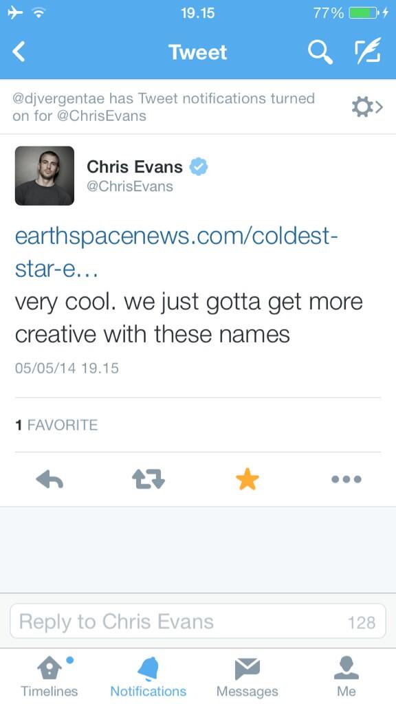 @ChrisEvans: http://earthspacenews.com/coldest-star-ever-found/ … very cool. we just gotta get more creative with these names” Cap'n America's a nerd. It warms my heart.Thanks. Twitter will use this to make your timeline better. UndoUndo