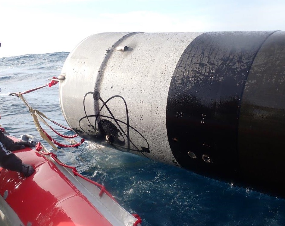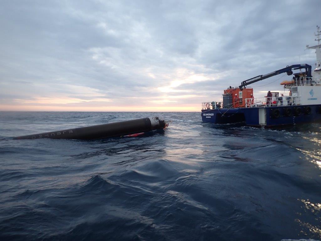 Beck: Stage oriented itself and controlled heating very well. Recovery systems and pilot chutes deployed at Mach 2. Drogues slowed it down, and then mains "deployed lovely." Impacted ocean at 9 m/s, 1 m/s slower than expected. 3/x
