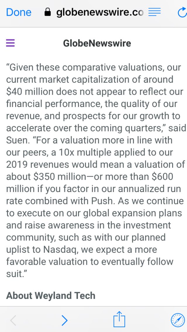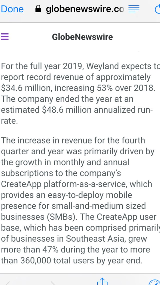 $WEYL Reports 2019 Preliminary Results: Revenue up 53% to Record $34.6 Million, Driving Fi...https://finance.yahoo.com/news/weyland-tech-reports-2019-preliminary-133110696.html?soc_src=hl-viewer&soc_trk=tw …Hvala. Twitter će to iskoristiti za poboljšanje vaše vremenske crte. PoništiPoništi -
