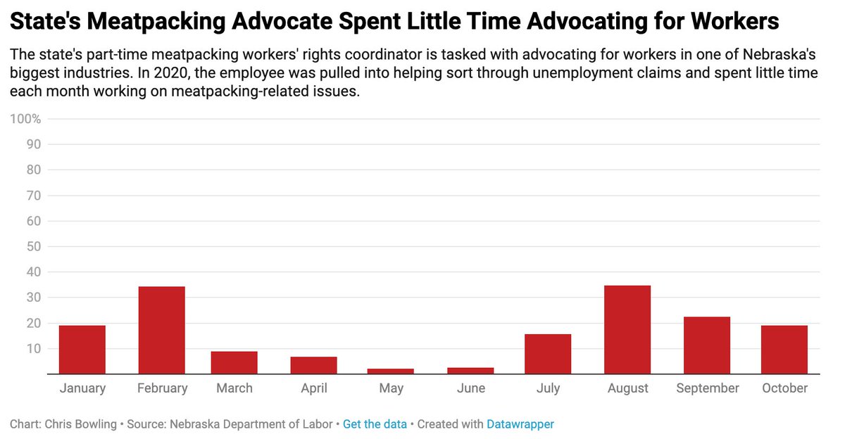 Last year, Nebraska's part-time employee tasked with overseeing an industry with thousands of workers, spent less than 14% of her time on average dealing with meatpacking issues. OSHA, the federal oversight arm, only fined meatpacking $100,000 nationwide for COVID-19 violations.pic.twitter.com/Dgxjop3mgv