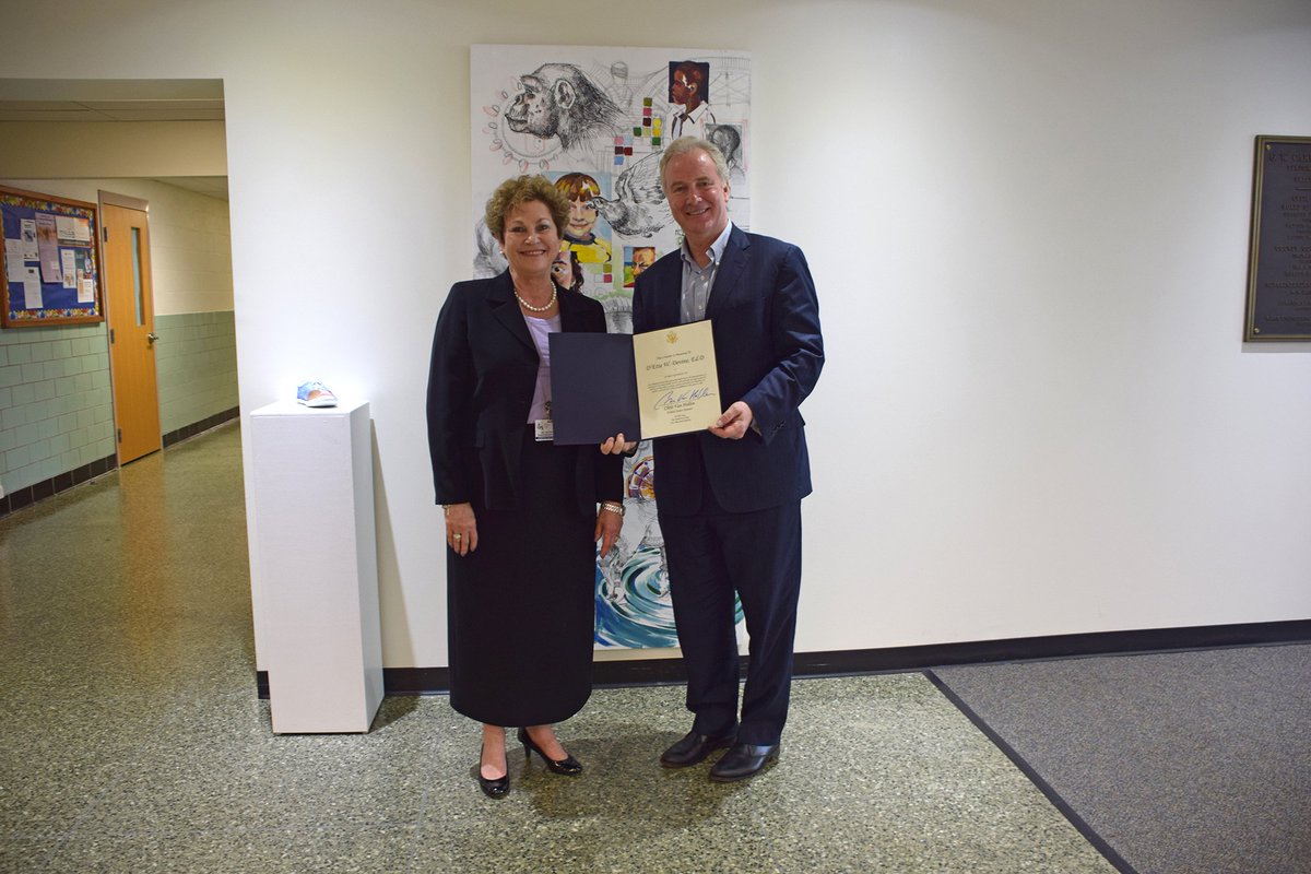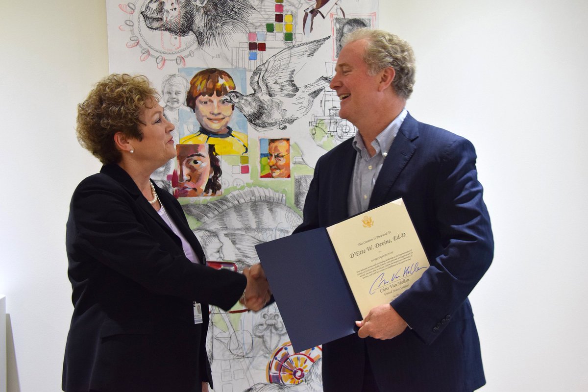 Senator @ChrisVanHollen visited Carver Center today to chat with Dr. Devine and present her with a certificate recognizing her leadership at CCPS. pic.twitter.com/0JqcEpochu